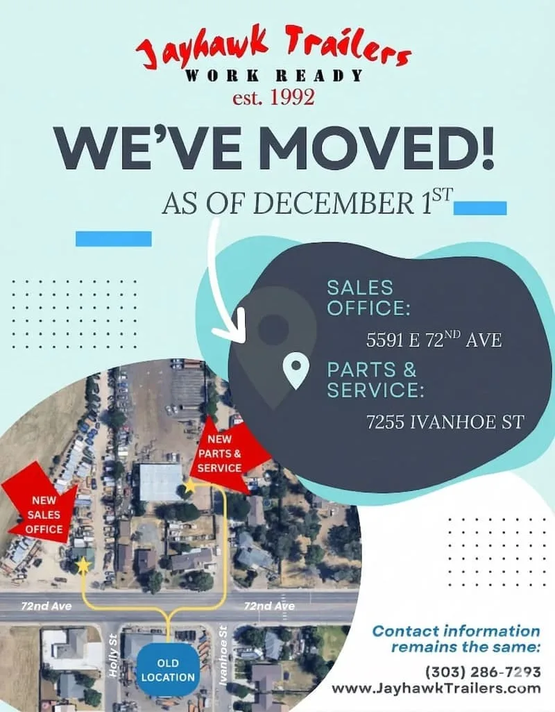 Visit us at our location at 5591 E 72nd Ave, Commerce City, where we are open 6 days a week to serve you as a top Denver trailer dealer. Whether you need a trailer for work or play, Jayhawk Trailers is your go-to destination for all things trailers in the Denver Metro Area.